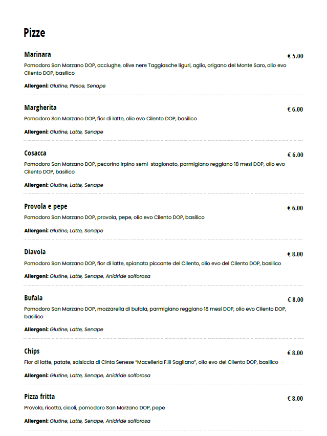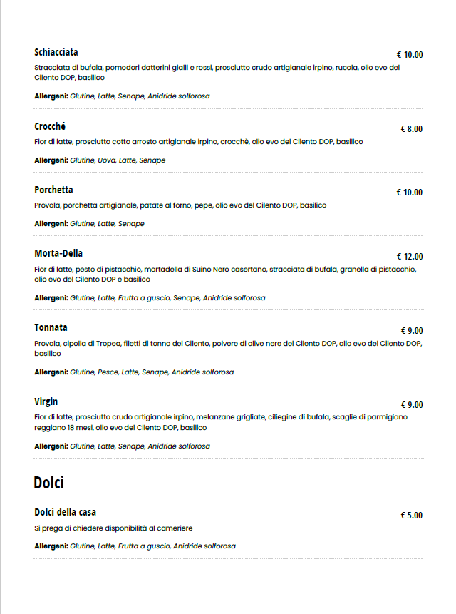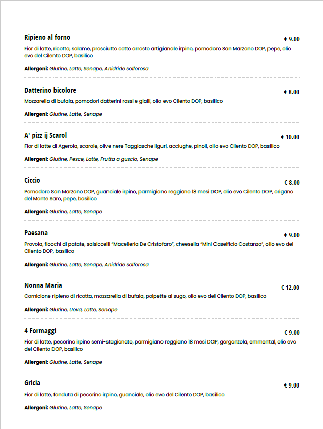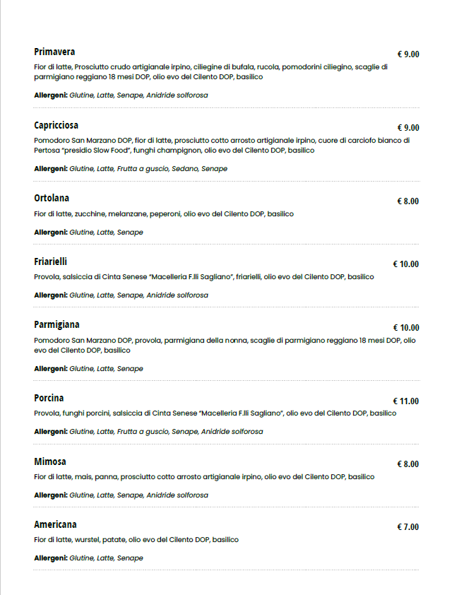 Fior di latte, ricotta, salame dolce, prosciutto cotto arrosto artigianale Irpino, pomodoro San Marzano D.O.P, pepe, olio EVO del Cilento D.O.P, basilico
