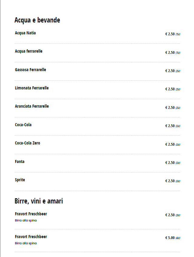 When it comes to beverages, the Bevande section provides refreshing choices such as Fanta 330 Ml, Coca-Cola 330 Ml, and Coca-Cola Zero 330 Ml. For those looking for a more mineral option, there are also waters like Acqua Electa 0,50 Cl and Acqua Ferrarelle 0,50 Cl to complement your meal.