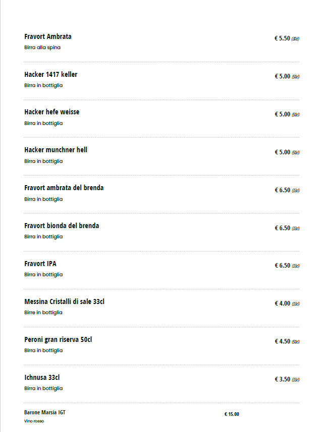 The Birre section features a selection of Italian beers, with options like Peroni Gran Riserva Rossa Birra 50 Cl, the light and refreshing Fravort Bionda Del Brenta 33 Cl, and the ever-popular Birra Peroni 33 Cl. If you're in the mood for something with a deeper flavor, Leffe Bionda 33 Cl and Leffe Rossa 33 Cl are also available.